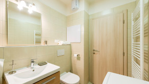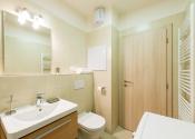 - kúpeľňa: vaňa, batéria, kúpeľňová skrinka s umývadlom a batériou, moderný obklad i dlažba, práčka, osvetlenie, nové samostatné WC zn. Geberit s dvojitým splachovaním