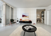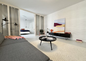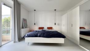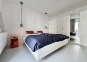 - spálňa s manželskou posteľou a skriňami zabezpečujúcimi dostatok úložného priestoru, je oddelená od obývacej izby sklenenou stenou so závesom