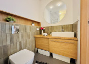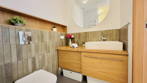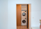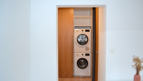 Po vstupe do bytu sa nachádzame vo vstupnej chodbe s priestrannou vstavanou skriňou, v rámci ktorej je umiestnená aj práčka so sušičkou. Ďalej sa tu nachádza kúpeľňa so sprchovým kútom, priestranná obývacia miestnosť s jedálenskou časťou, kuchyňa a samostatná spálňa (vybavená rolldorom).