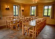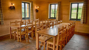 1.NP – vstupná chodba, herňa pre deti, chodba, kuchyňa, spoločenská miestnosť s krbom, garáž, sklad, dielňa, lyžiareň,