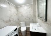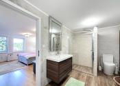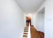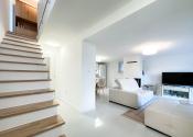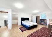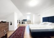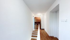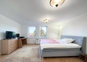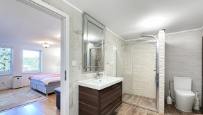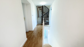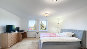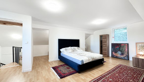vstupná chodba - priestranná obývacia izba s výstupom na terasu a do záhrady spojená s kuchyňou a jedálenským kútom - hosťovská toaleta - schodisko - veľká spálňa s kúpeľňou s vaňou, sprchovým kútom a toaletou - veľká priestranná izba s možnosťou prerobenia na 2 samostatbné izby.