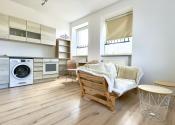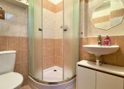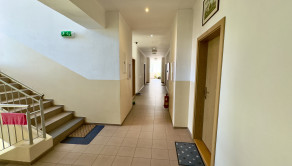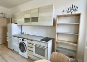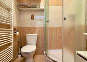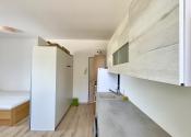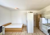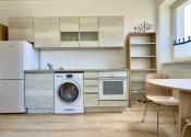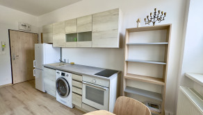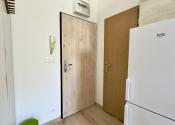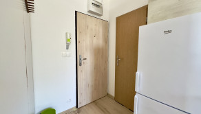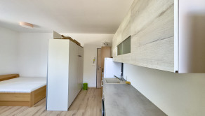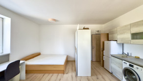 Vstupná chodba, vľavo kúpeľňa so sprchovým kútom a WC, kuchynská linka – so vstavanou rúrou, varnou doskou, voľne stojaca chladnička s mrazničkou, práčka so sušičkou, sedačka s TV stolíkom a TV, písací stolík, spací kút s manželskou posteľou oddelený voľne stojacím rolldorom. Byt sa predáva kompletne zariadený.
