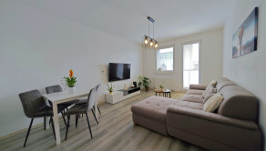 Obývacia izba s jedálenským kútom – priestranná a svetlá miestnosť zariadená v modernom štýle. Dominuje veľká pohodlná rohová sedačka v neutrálnej farbe, televízna stena so skrinkami a dekoráciami. Priestor je doplnený jedálenským stolom so štyrmi stoličkami, čo vytvára príjemné miesto na stolovanie. Z obývačky je priamy vstup na balkón, čo zabezpečuje dostatok prirodzeného svetla.