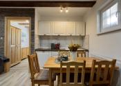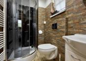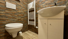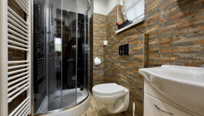 1.NP – obývacia izba s kuchynským kútom, samostatné WC, 2 spálne, z 1 spálne je vstup do kúpeľne so sprchovým kútom a WC