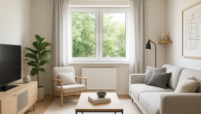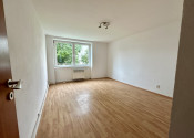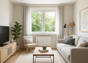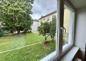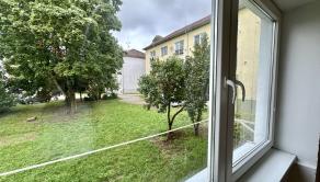 Priestranná obývacia izba so širokým oknom s výhľadom do zeleného vnútrobloku.