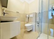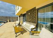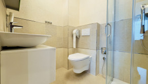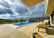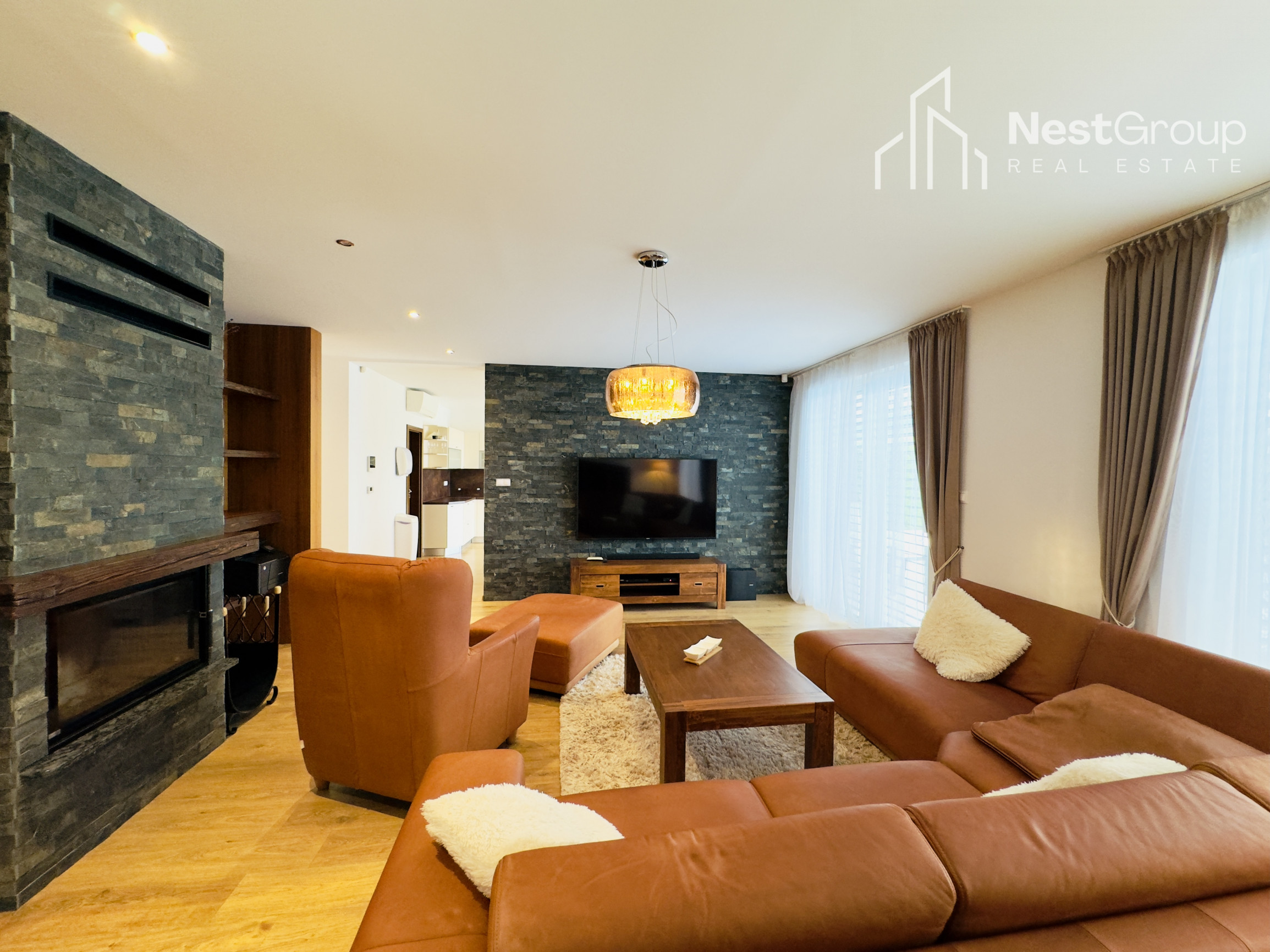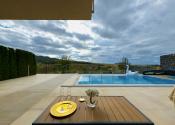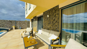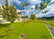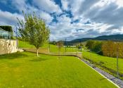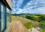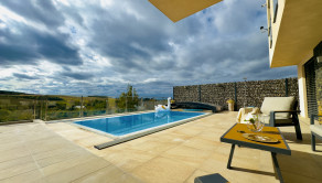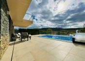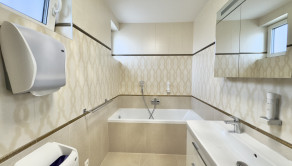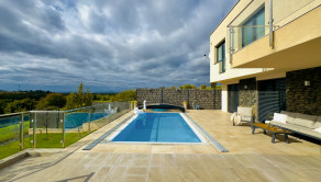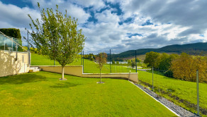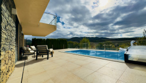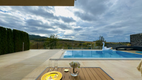 Exteriér – priamo z kuchyne sa vchádza na prestrešenú terasu, odkiaľ si vychutnáte krásne výhľady nielen na prírodu, ale osviežiť sa môžete v bazéne alebo využijete sprchu. Bazén s protiprúdom a vyhrievaním viete využiť celoročne. Schodíkmi sa dostanete do záhrady.