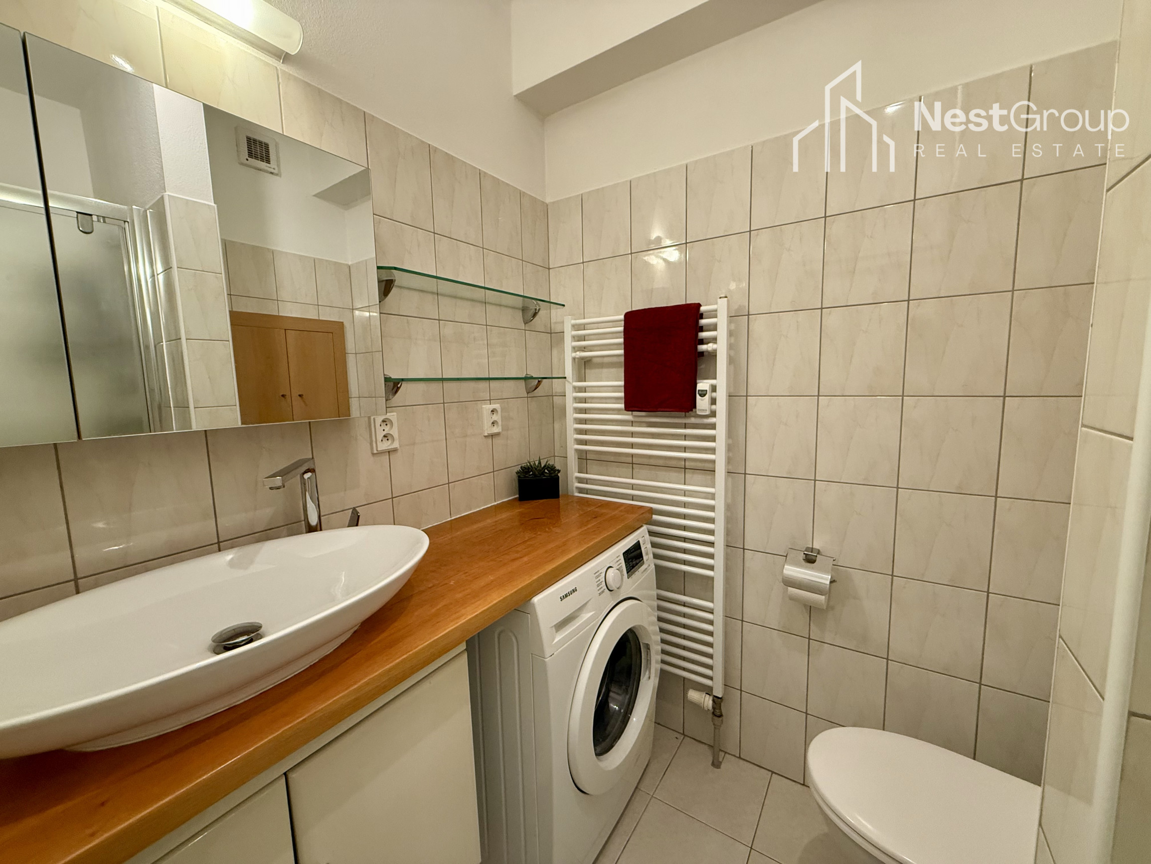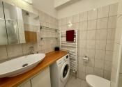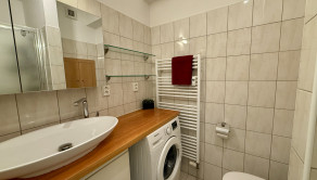 Kúpeľňa je čistá, udržiavaná a funkčne riešená, vybavená sprchovým kútom, umývadlom a práčkou.